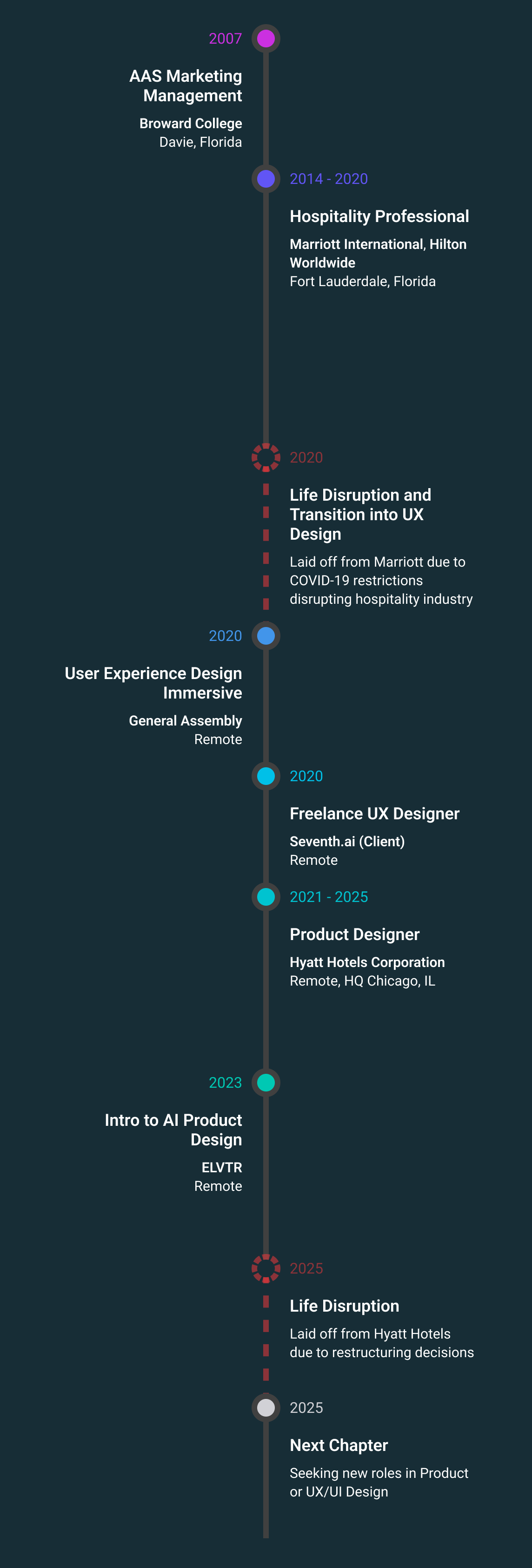 I’m a Product Designer with a background in hospitality, which has shaped my user-centered approach and commitment to creating inclusive, impactful designs. My career path led me to UX through an immersive design course, where I honed the skills to thrive in this dynamic field.